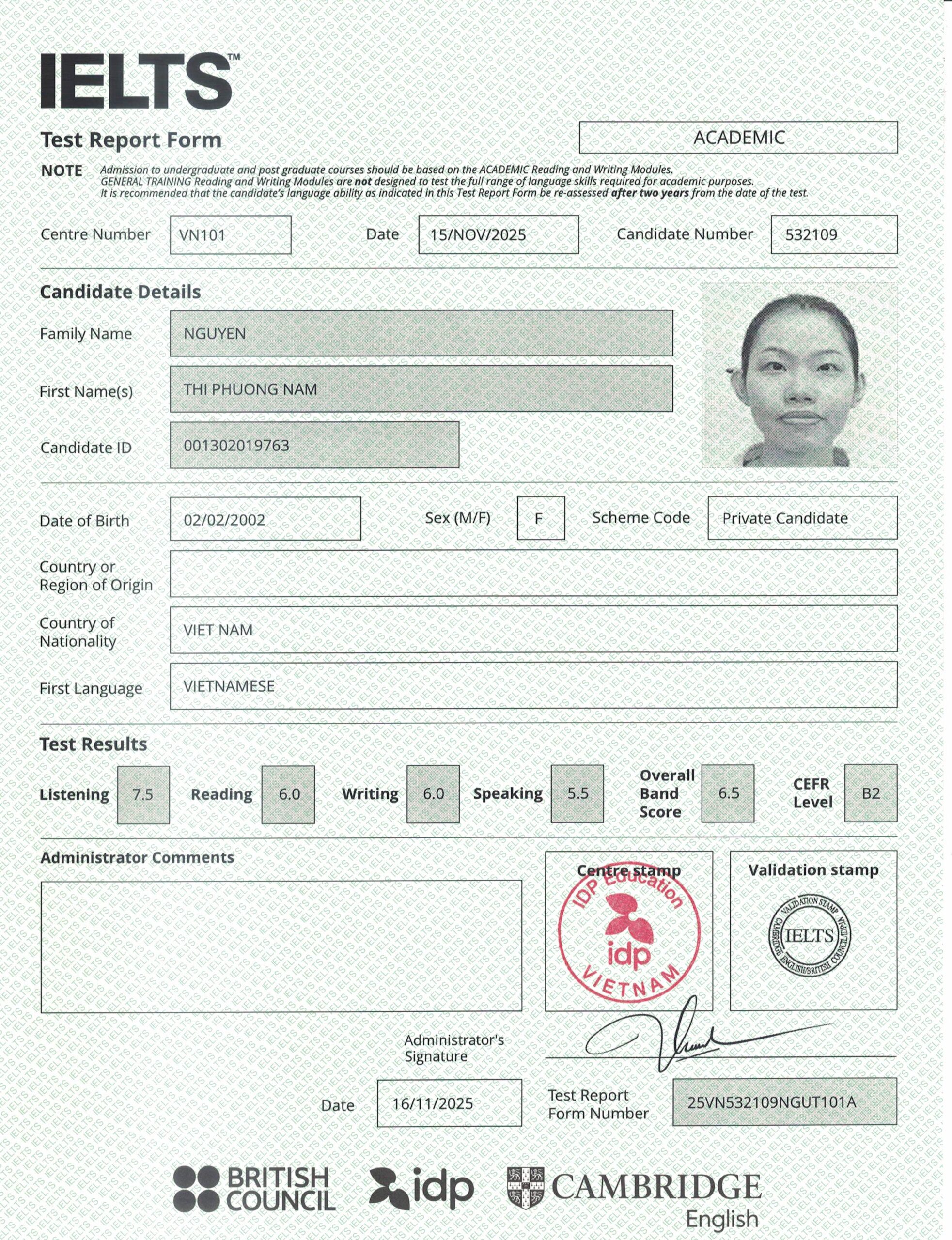 Phương Nam bắt đầu hành trình ôn luyện IELTS tại Trung tâm Anh ngữ Huy Trịnh từ tháng 09/2025. Vì công việc bận rộn, em chỉ có 2 tháng để ôn luyện cấp tốc trước kỳ thi. Mặc dù gặp không ít khó khăn ban đầu, nhưng nhờ lộ trình rõ ràng và sự theo sát tận tình của giáo viên, Phương Nam đã tiến bộ vượt bậc chỉ trong thời gian ngắn.